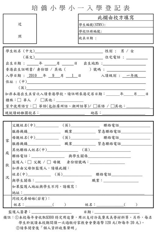 小一入學登記表: